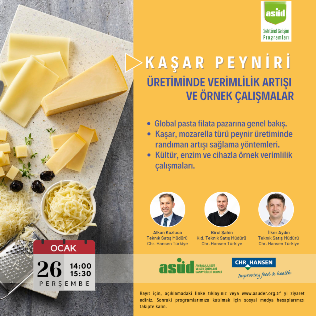 Peynir Akademisi webinarlarımızın bu ayki konusu “Kaşar Peyniri Üretiminde Verimlilik Artışı ve Örnek Çalışmalar” webinarlara aşağıdaki link üzerinden kayıt olabilirsiniz. (Link açılmaz ise lütfen kopyalayıp, tarayıcınızın adres kısmına yapıştırınız.)
