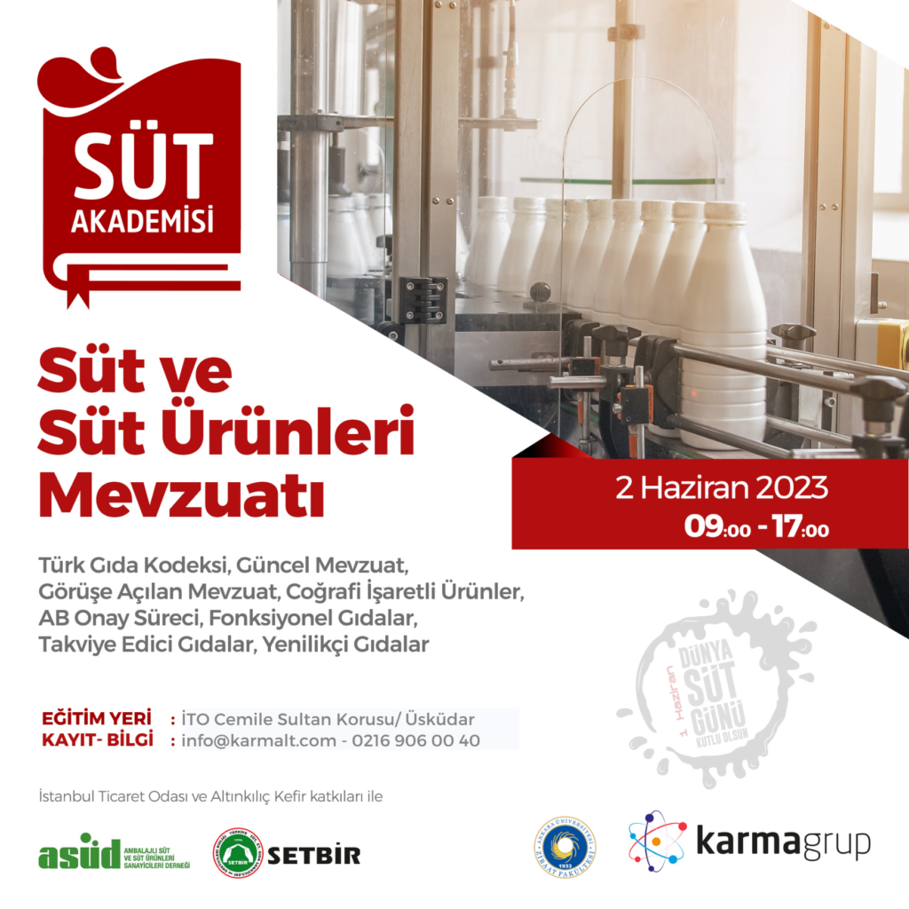 Süt Akademisi’nin Haziran ayı konu başlığı; Süt ve süt ürünlerinin ulusal ve uluslararası mevzuatı. Dünya Süt günü kapsamında düzenlenecek program 02 Haziran, cuma günü İTO Cemile Sultan Korusu Seminer salonunda gerçekleştirilecek. Programda Tarım ve Orman Bakanlığı Gıda ve Kontrol Genel Müdürlüğü temsilcileri, akademisyenler ve süt endüstrisinin regülasyondan sorumlu yöneticileri bir araya gelecek. Sektör sektörünün günlük uygulamalarda karşılaştıkları regülasyon kaynaklı problemler, mevcut yasal düzenlemelerin inovasyon ve ARGE çalışmaları ile uyumu ve coğrafi işaretlemenin yasal boyutları masaya yatırılarak, gıda kodeksi çerçevesindeki çözümler akademik bakış açısıyla değerlendirilecek.EĞİTİM PROGRAMI :